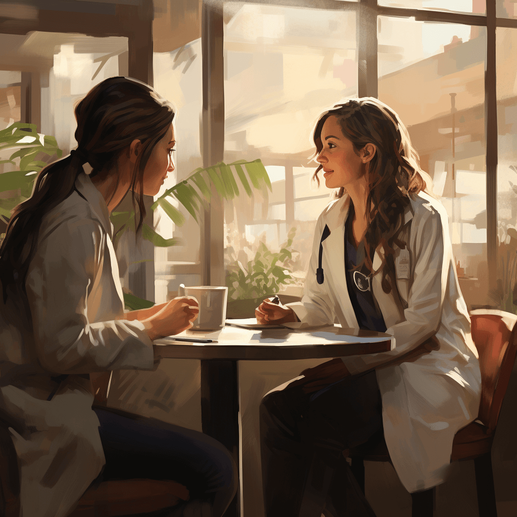 서울의 한 조용한 카페에서 지은과 수진은 오랜만에 만나 커피를 마시며 이야기를 나누고 있었다. 지은은 최근 건강 관련 기사를 많이 접하면서 유방암에 대한 궁금증이 생겼다. 그런데 운이 좋게도 수진은 병원에서 근무하는 의사였다. 지은은 이 기회를 놓치지 않고 유방암에 대한 질문을 시작했다.